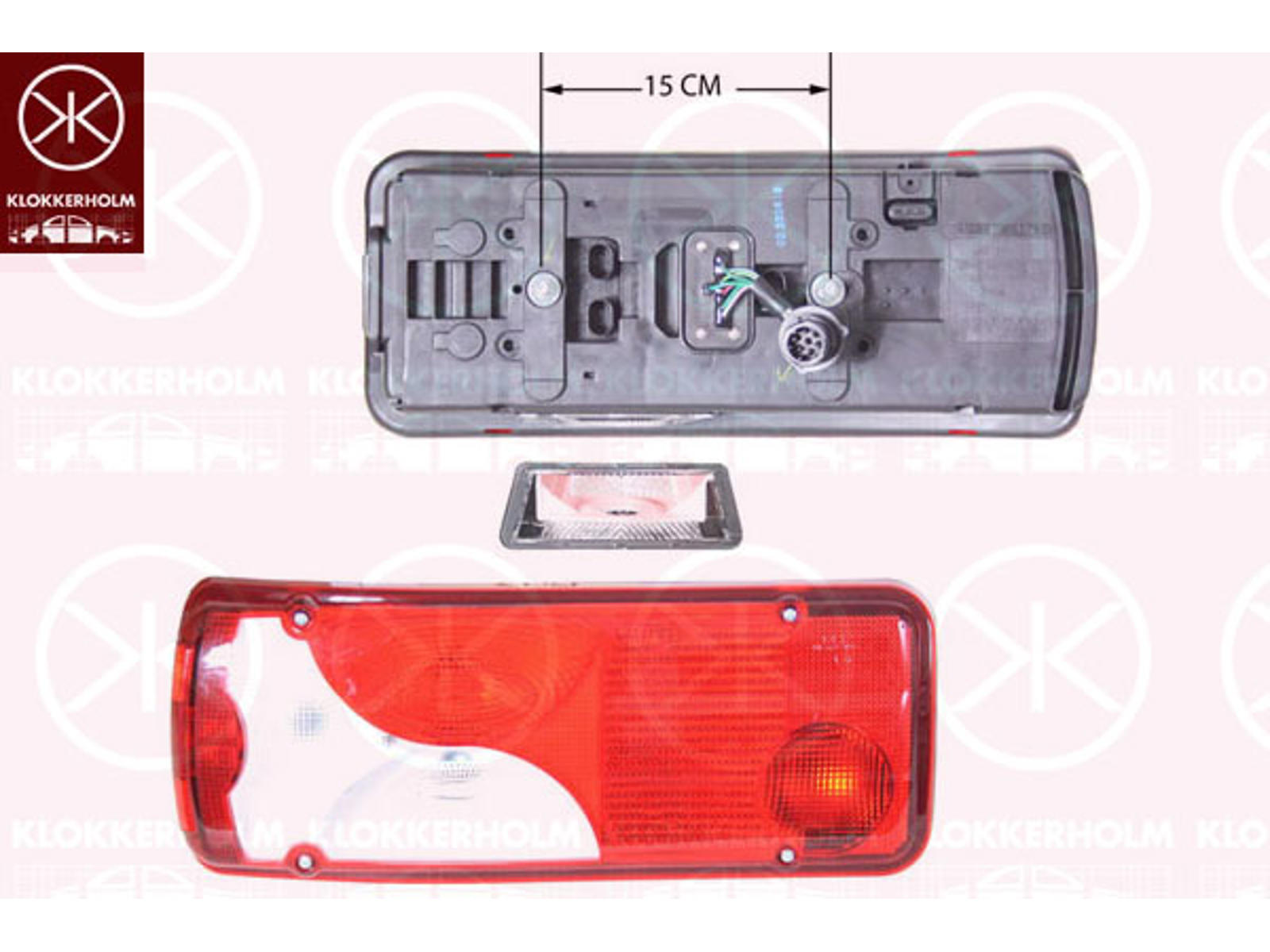 Tail Light Assembly, Left, Width [cm]: 40, Height [cm]: 16, with number plate light, with front fog light, with reverse light, with bulb holder, with cable, Bolt Distance [mm]: 150